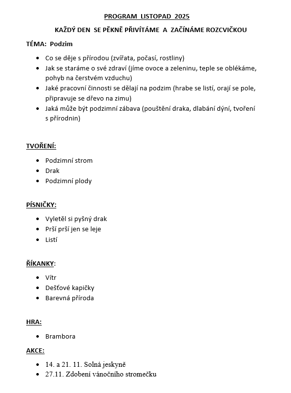 Děti z této třídy se účastní akcí pořádaných školkou vč. výletu mimo objekt.