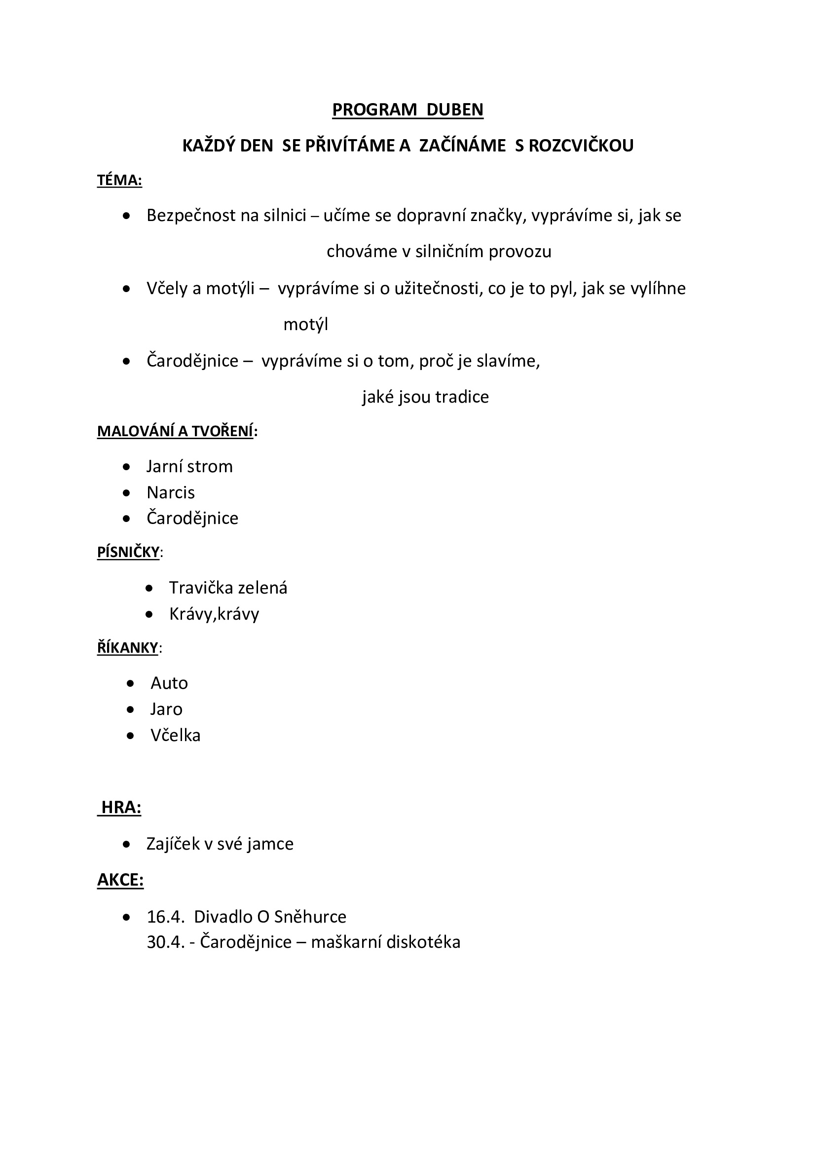 | 15:45 - 17:30 hod. | Volné aktivity na herně, zahradě. Vyzvedání dětí. |