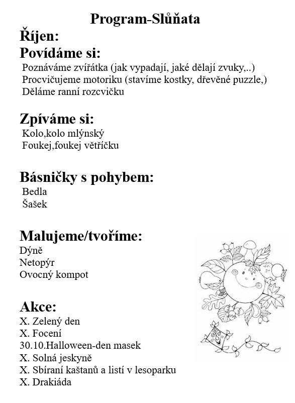 Program této třídy stejně jako u třídy ,, Slůňat ,, je připravován dle pedagogických metodik, aby směřoval k zdravému vývoji dítěte v daném věku , přípravu a bezproblémové zařazení do předškolního zařazení.
