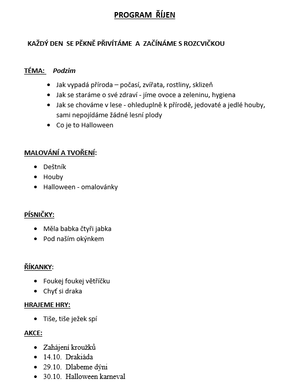 Veškeré činnosti a aktivity probíhají, tak aby se líbily Vašim dětem a jsou zaměřeny na zdravý fyzický a psychický vývoj dítěte v daném věku života.